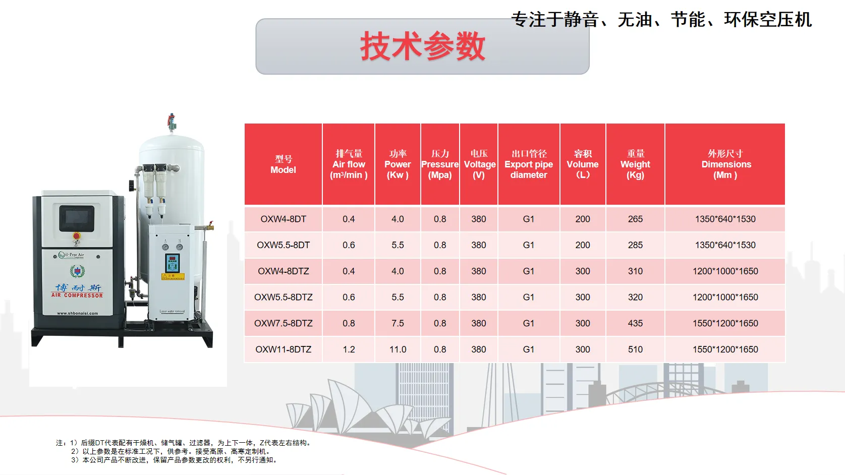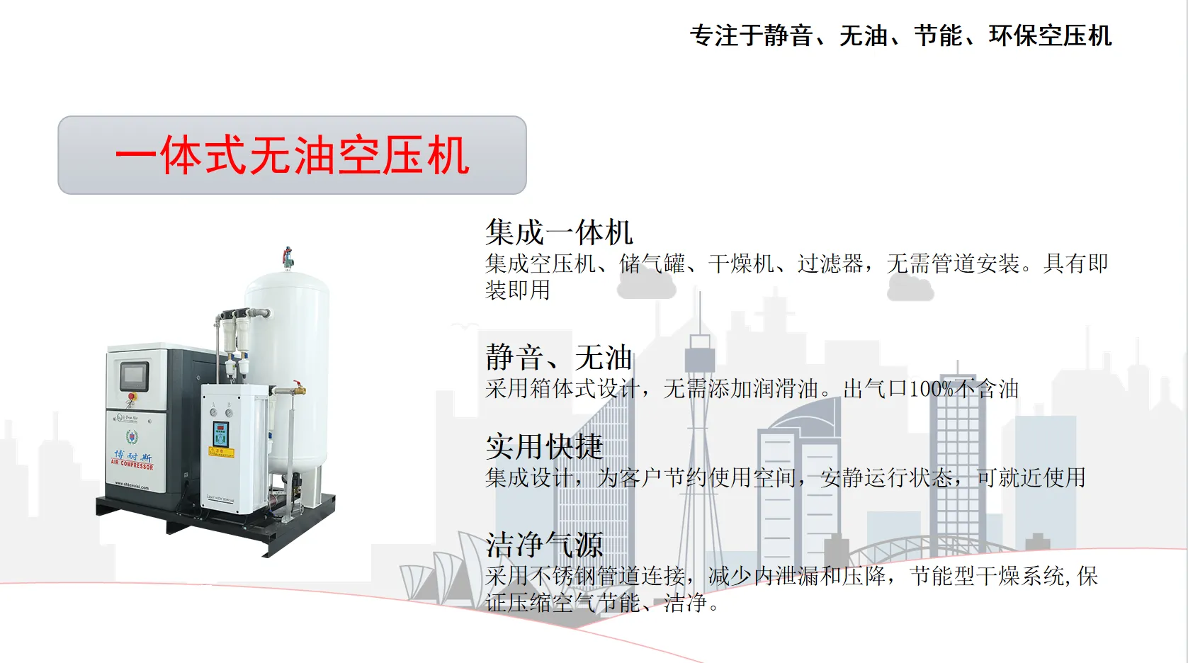 无油螺杆空压机 干式无油螺杆空压机 无油涡旋空压机 静音无油空压机 储气罐 干燥机 过滤器 不锈钢节能管道